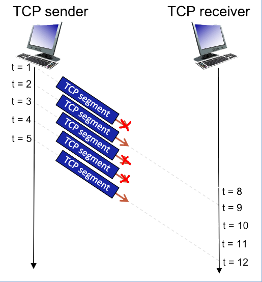 Consider the figure below in which a TCP sender and receiver communicate over a connection in which the sender->receiver segments may be lost. The TCP sender sends an initial window of 5 segments. Suppose the initial value of the sender->receiver sequence number is 425 and the first 5 segments each contain 641 bytes. The delay between the sender and receiver is 7 time units, and so the first segment arrives at the receiver at t=8. As shown in the figure below, 3 of the 5 segment(s) are lost between the segment and receiver.